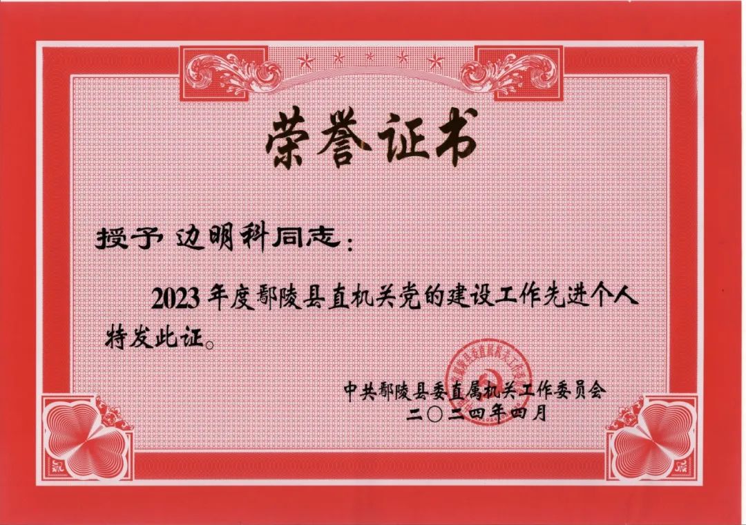 党办主任边明科被评为“2023年度鄢陵县直机关党的建设工作先进个人”。
