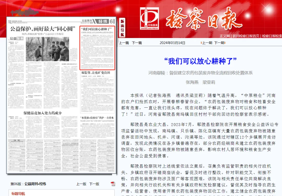 3月14日《检察日报》6版《“我们可以放心耕种了” 河南鄢陵:督促建立农药包装废弃物全流程回收处置体系